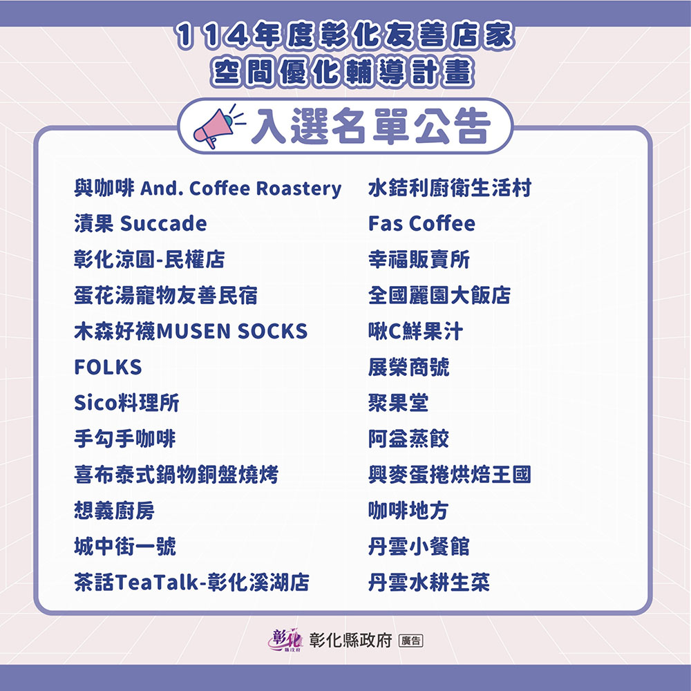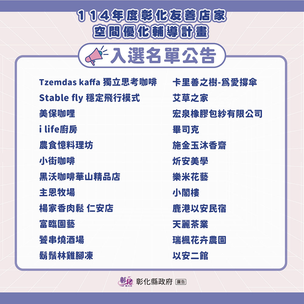 📣 114彰化友善店家空間優化輔導計畫 入選名單公告